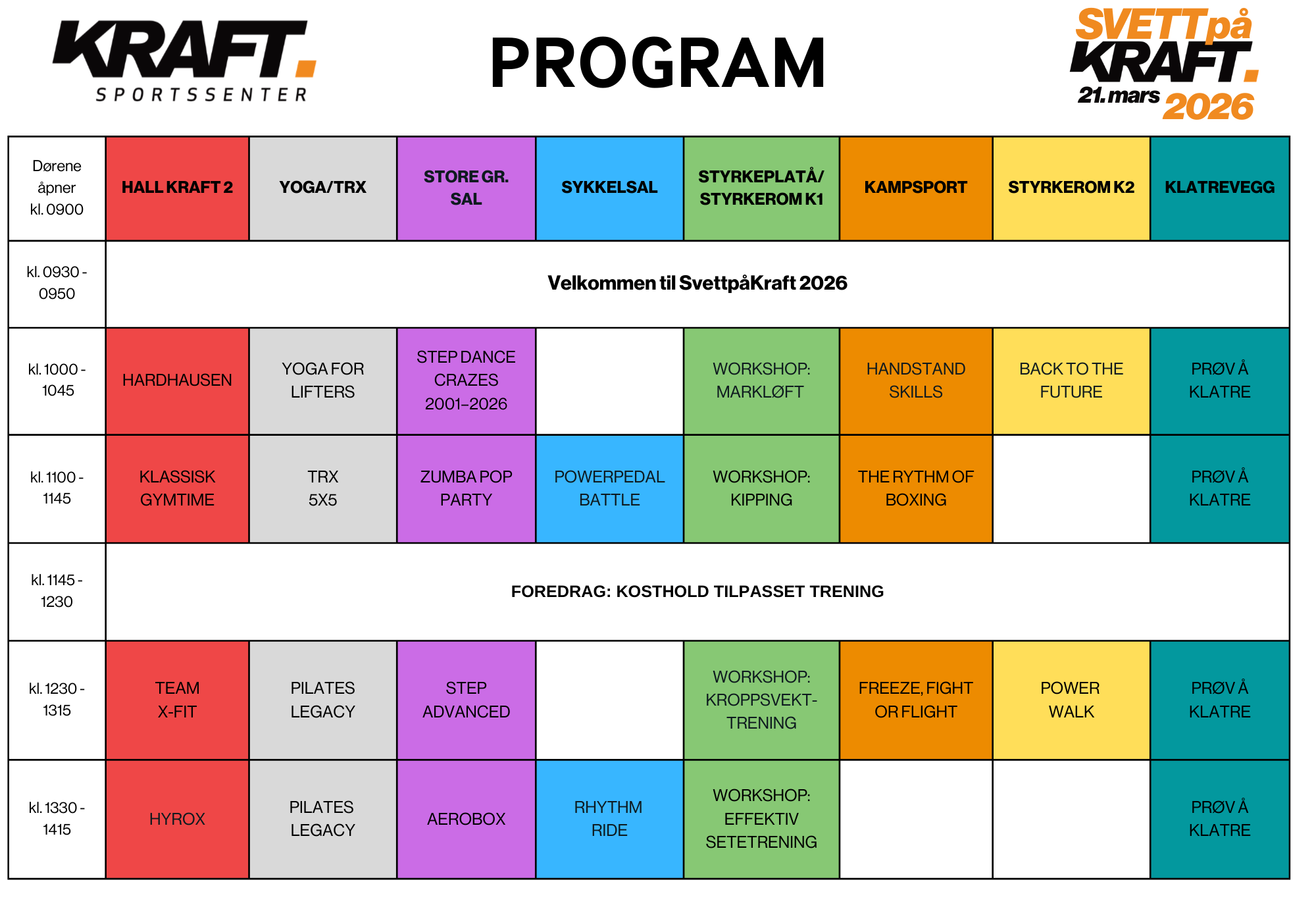 Lørdag 21. mars inviterer vi deg igjen til treningsfest på Kraft Sportssenter! De siste årene har vi hatt stor suksess med Svett på Kraft, vår egen treningsconvention, og nå gjør vi det igjen – vi gleder oss til å fylle salene med treningsglede, energi og fellesskap!