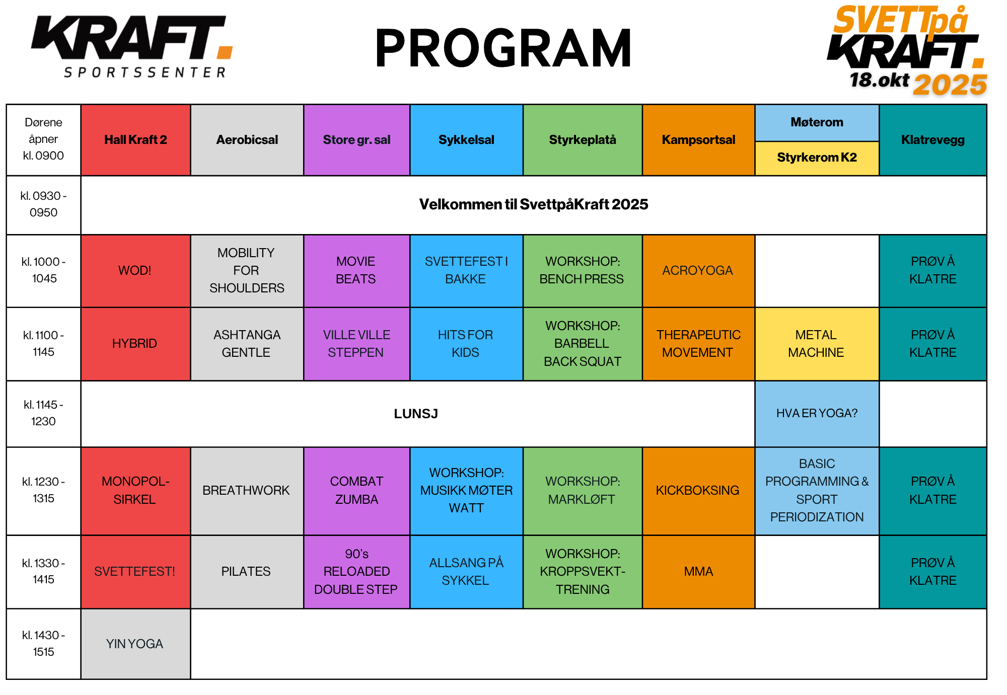 Lørdag 18. oktober inviterer vi deg igjen til treningsfest på Kraft Sportssenter! De siste årene har vi hatt stor suksess med Svett på Kraft, vår egen treningsconvention, og nå gjør vi det igjen – vi gleder oss til å fylle salene med treningsglede, energi og fellesskap!